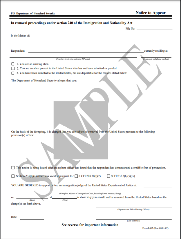 La Notificación de Comparecencia (NTA, por sus siglas en inglés), es un formato que utiliza el Departamento de Seguridad Nacional de los Estados Unidos (DHS), para explicarte las razones por las cuales desea deportarte. Todas las personas que se encuentran en procesos migratorios reciben una NTA.